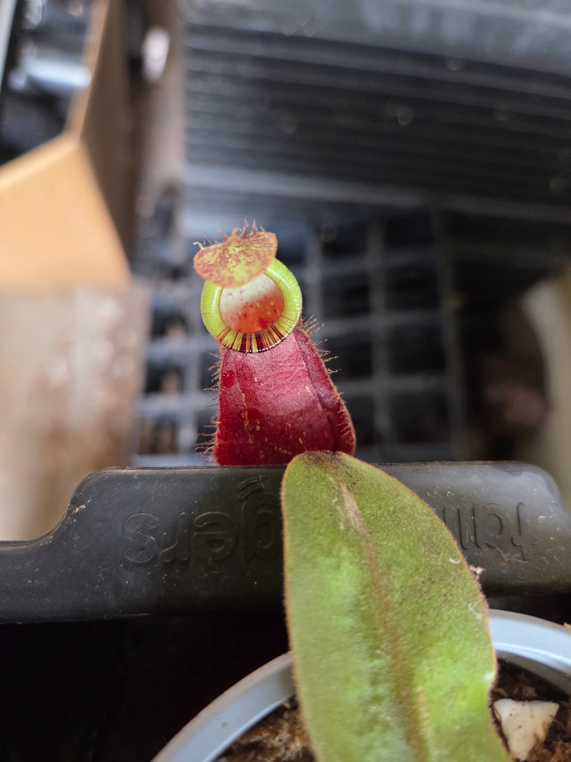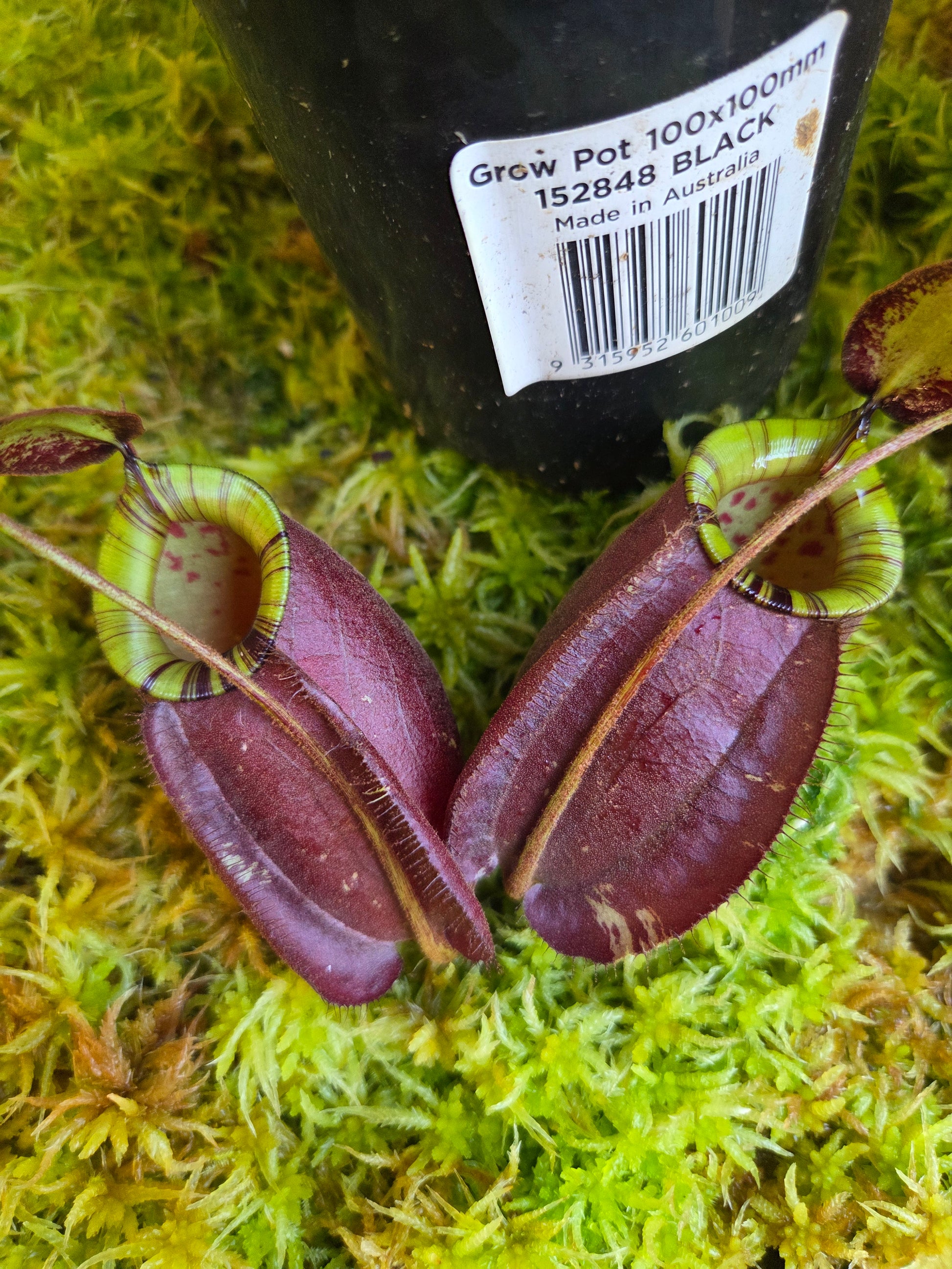 This variant shows deep colouration of the pitchers from dark red to dark purple. Peristome is a vibrant green dark purple striping that really contrasts well with the body of the pitcher.